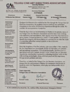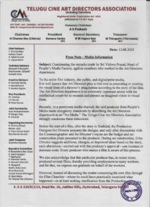 Recently, in a prominent media channel, the said producer from People’s Media made derogatory comments by describing the Art Directors department as an “Art Mafia.” The Telugu Cine Art Directors Association strongly condemns these statements.